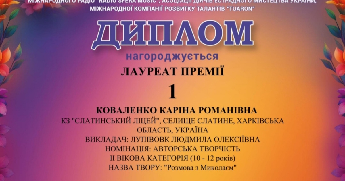 Щира подяка керівнику - ЛУПІВОВК Людмилі Олексіївні - за професійну підтримку, натхнення та віру в здібності дитини. Ваша праця приносить чудові результати! 💙💛